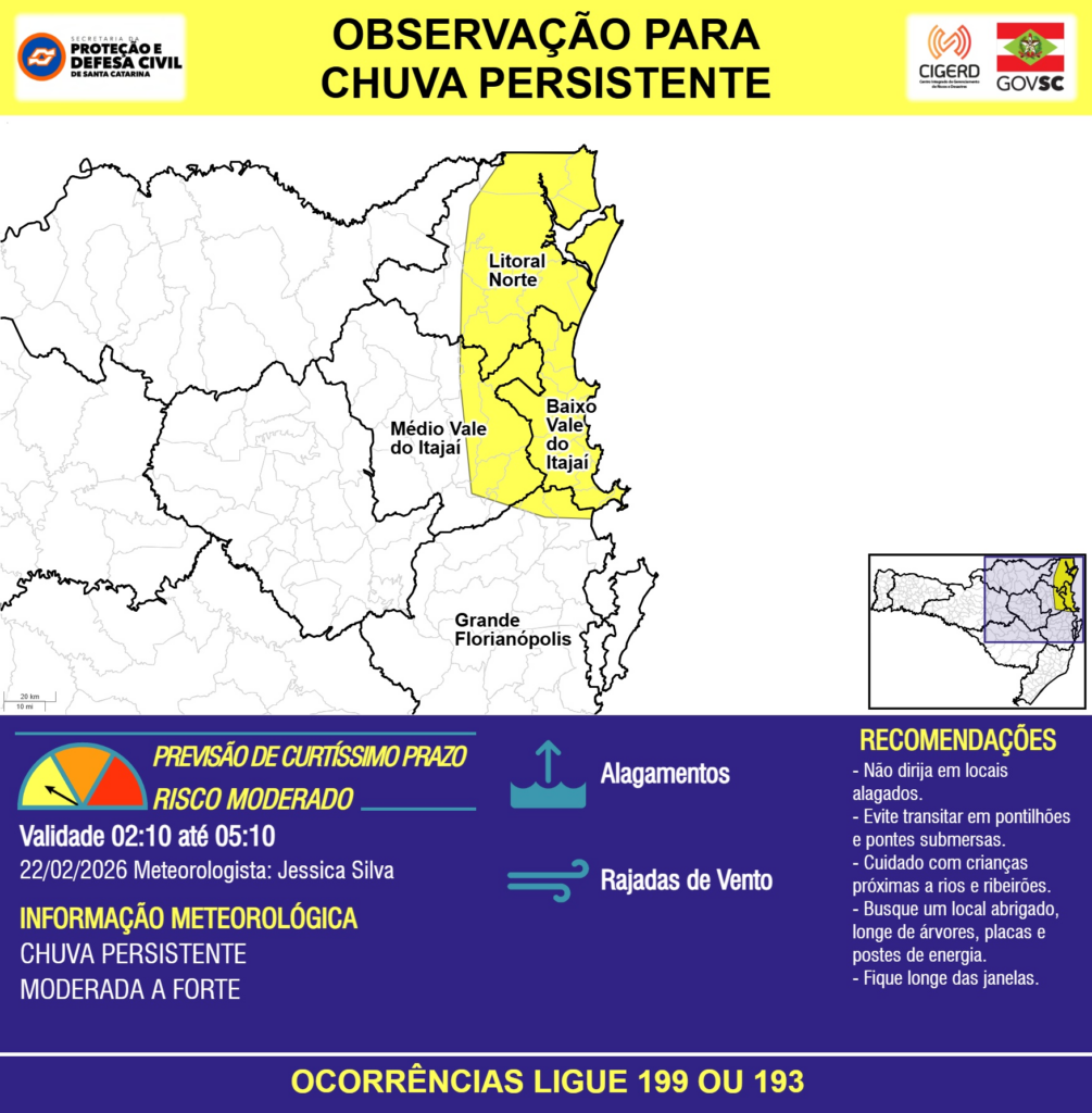 OBSERVAÇÃO – 22/02 02:10 – CHUVA PERSISTENTE de intensidade moderada a forte com RAJADAS DE VENTO e ALAGAMENTOS pontuais para as regiões do Litoral Norte, Grande Florianópolis, Baixo e Médio Vale do Itajaí nas próximas 3 horas. Ocorrências ligue 199 ou 193.
