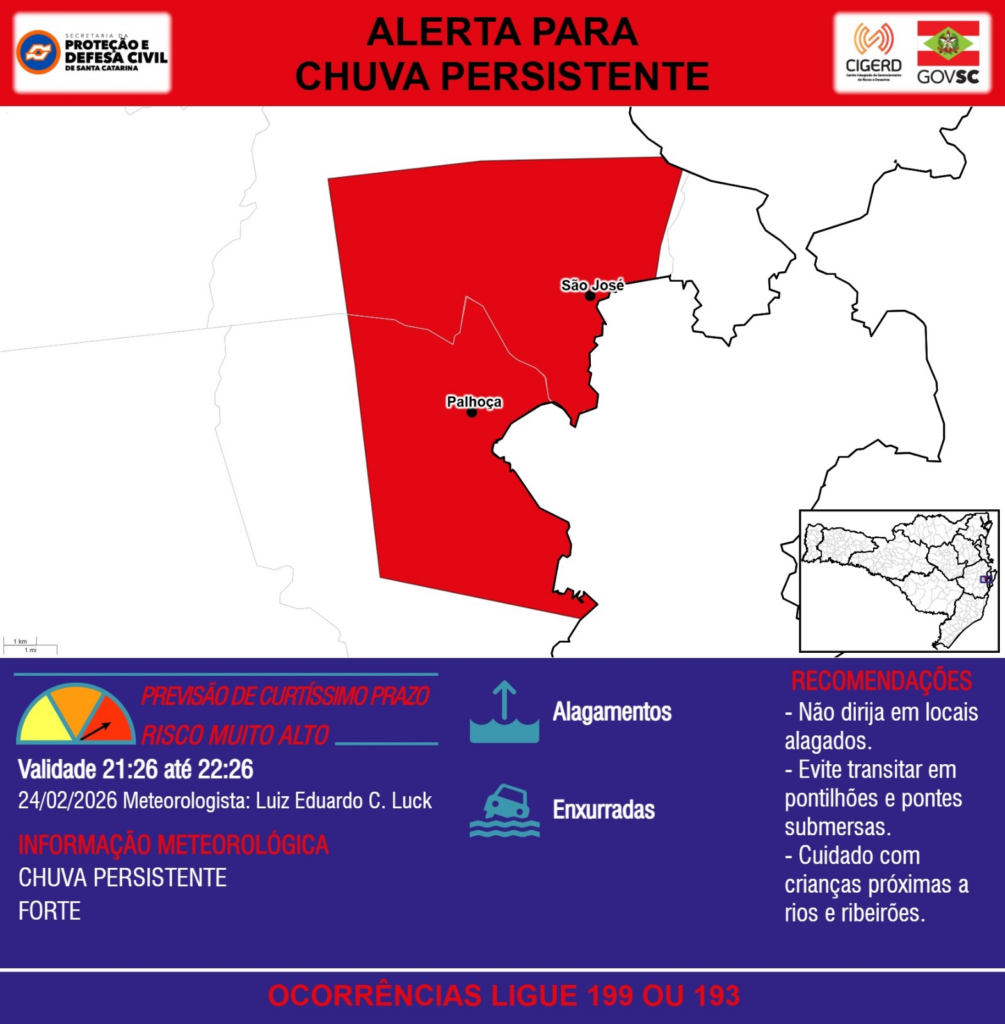ALERTA – 24/02 21:26 – CHUVA PERSISTENTE de intensidade forte com ALAGAMENTOS e risco de ENXURRADAS para os municípios de Palhoça e São José na próxima hora. Ocorrências ligue 199 ou 193.