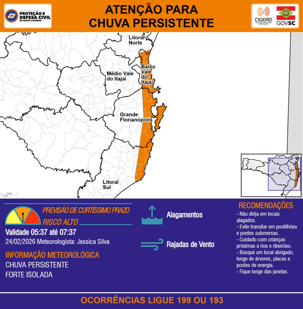 ATENÇÃO – 24/02 05:37 – CHUVA PERSISTENTE de intensidade forte isolada com ALAGAMENTOS e RAJADAS DE VENTO para as regiões do Litoral Norte, Litoral Sul, Grande Florianópolis, Baixo e Médio Vale do Itajaí nas próximas 2 horas. Ocorrências ligue 199 ou 193.