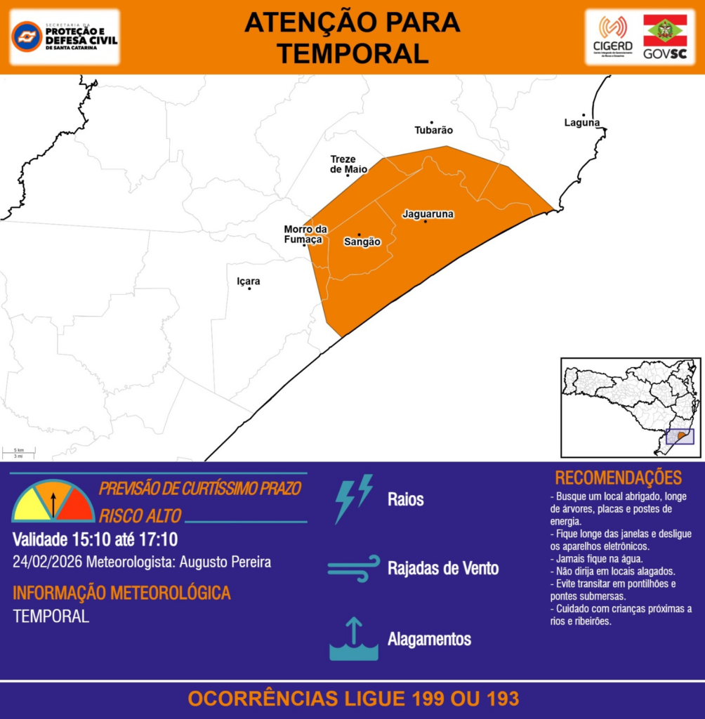 ATENÇÃO – 24/02 15:10 – TEMPORAL com RAIOS, RAJADAS DE VENTO e ALAGAMENTOS para os municípios de Içara, Jaguaruna, Laguna, Morro da Fumaça, Sangão, Treze de Maio e Tubarão nas próximas 2 horas. Ocorrências ligue 199 ou 193.