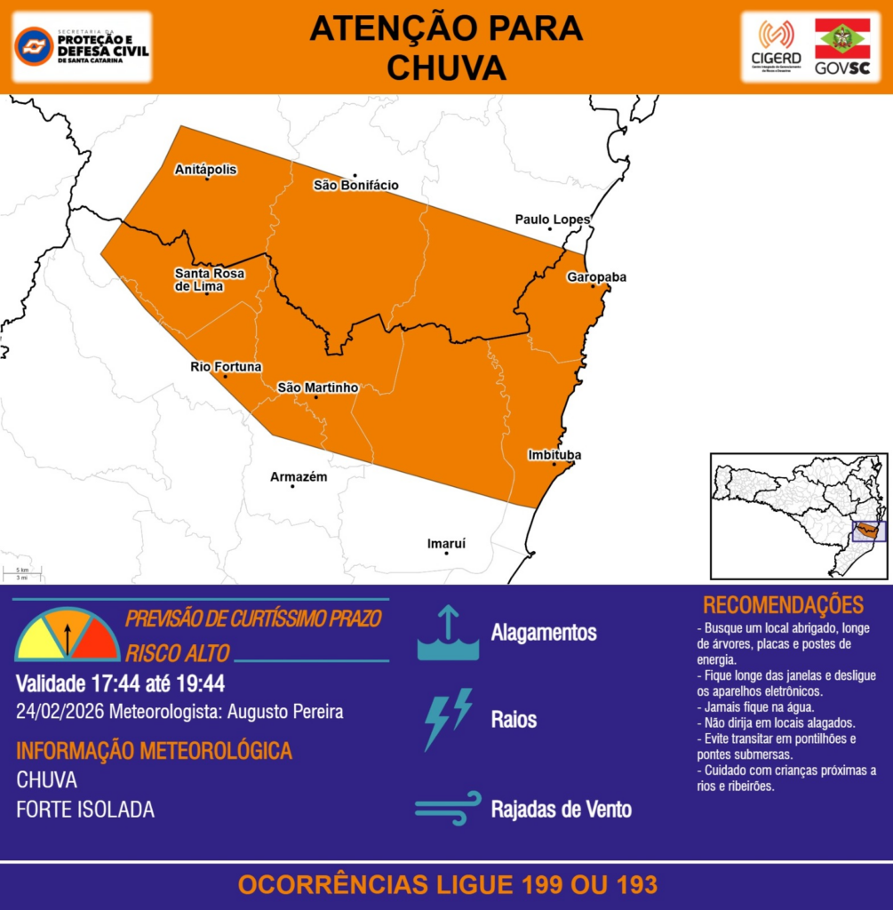 ATENÇÃO – 24/02 17:44 – CHUVA de intensidade forte isolada com ALAGAMENTOS, RAIOS e RAJADAS DE VENTO para os municípios de Anitápolis, Armazém, Garopaba, Imaruí, Imbituba, Paulo Lopes, Rio Fortuna, Santa Rosa de Lima, São Bonifácio e São Martinho nas próximas 2 horas. Ocorrências ligue 199 ou 193.