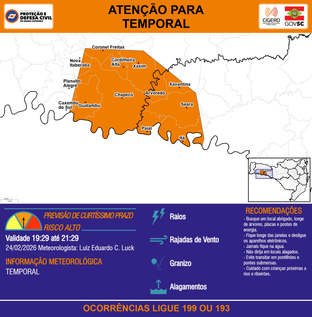 ATENÇÃO – 24/02 19:29 – TEMPORAL com RAIOS, RAJADAS DE VENTO, GRANIZO e ALAGAMENTOS para os municípios de Arvoredo, Caxambu do Sul, Chapecó, Cordilheira Alta, Coronel Freitas, Guatambu, Itá, Nova Itaberaba, Paial, Planalto Alegre, Seara, Xavantina e Xaxim nas próximas 2 horas. Ocorrências ligue 199 ou 193.