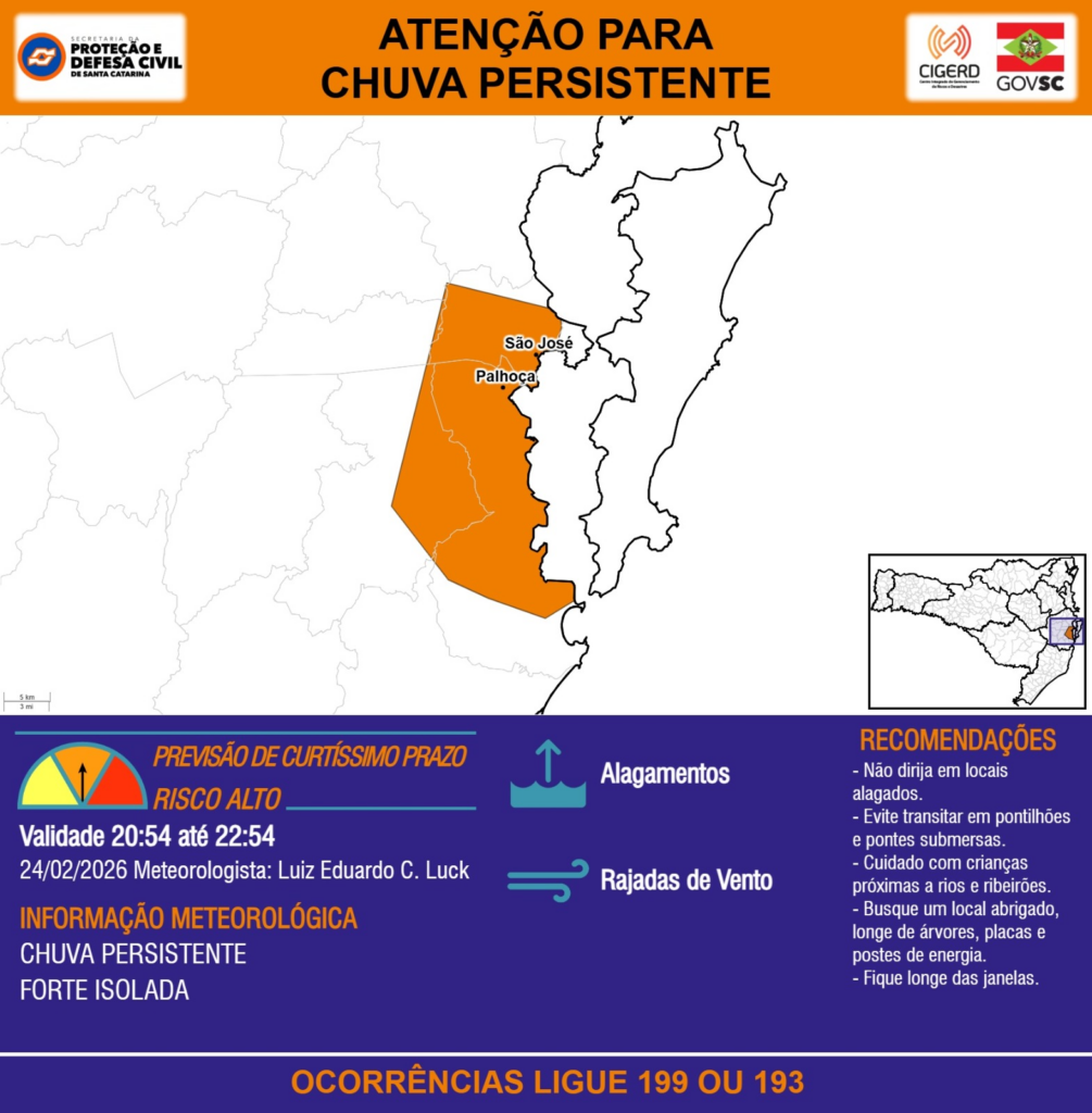 ATENÇÃO – 24/02 20:54 – CHUVA PERSISTENTE de intensidade forte isolada com ALAGAMENTOS e RAJADAS DE VENTO para os municípios de Palhoça, São José nas próximas 2 horas. Ocorrências ligue 199 ou 193.