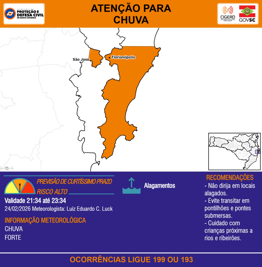 ATENÇÃO – 24/02 21:34 – CHUVA de intensidade forte com ALAGAMENTOS para os municípios de Florianópolis e São José nas próximas 2 horas. Ocorrências ligue 199 ou 193.