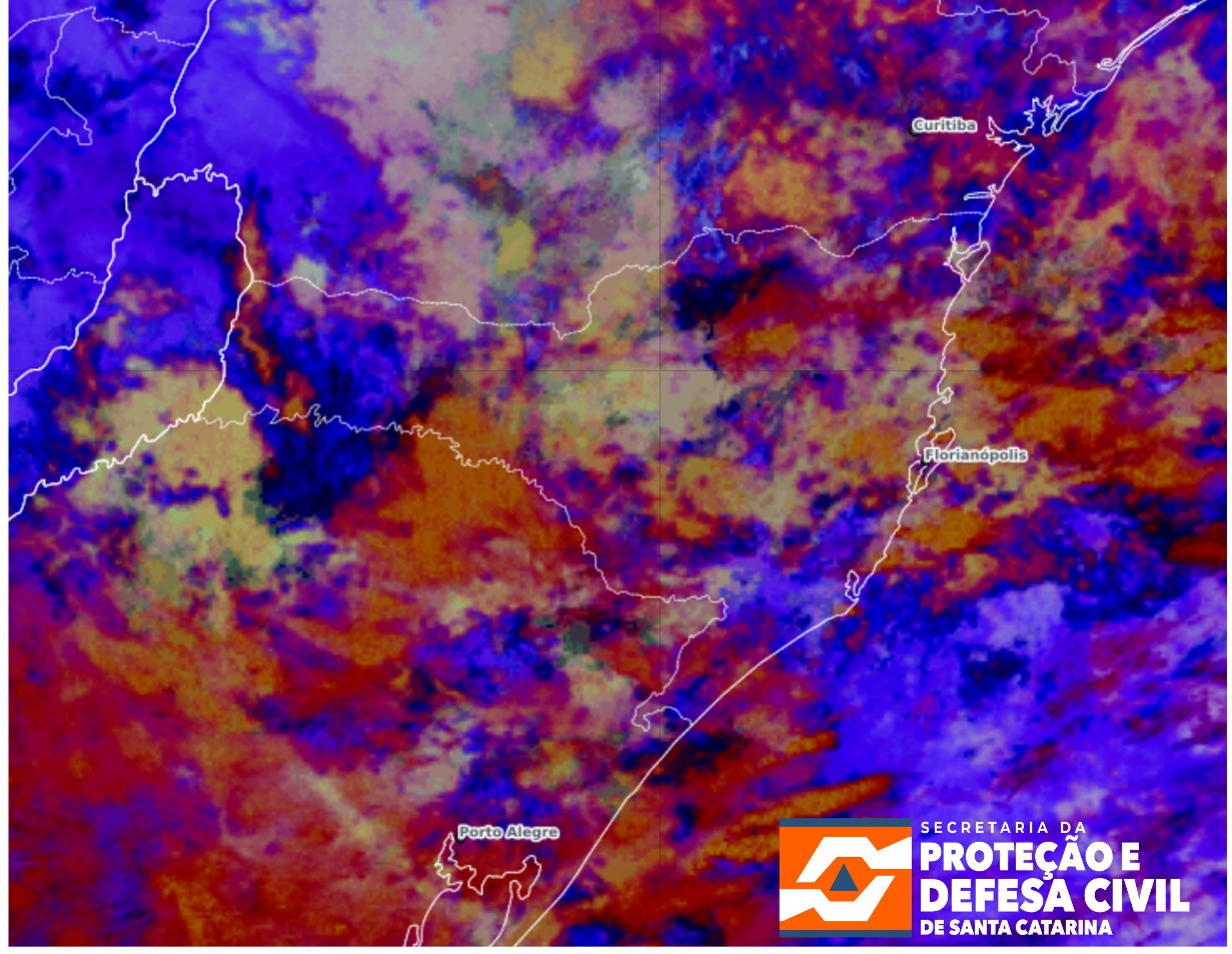 Figura: Imagem do satélite GOES-19, produto Nighttime Microphysics, às 05h00, horário local. Fonte: DSAT/CPTEC, adaptado por SDC/SC.