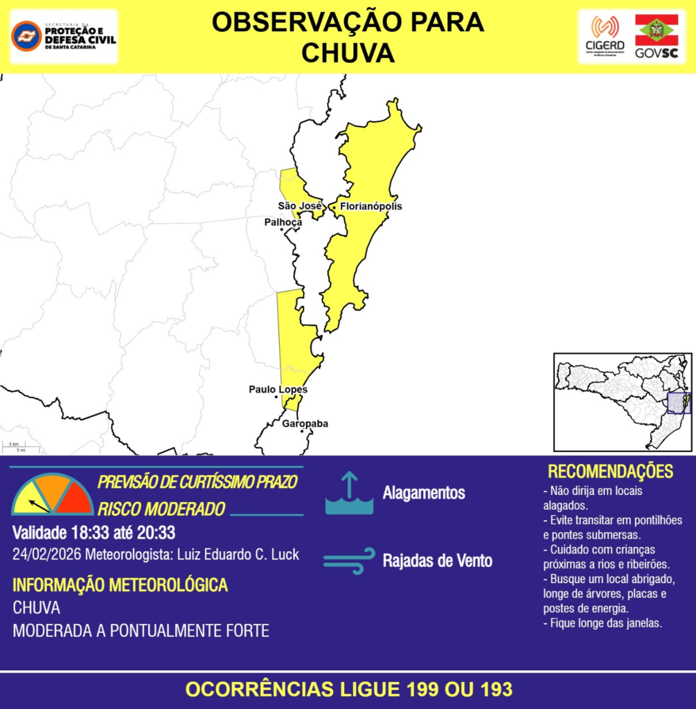 OBSERVAÇÃO – 24/02 18:33 – CHUVA de intensidade moderada a pontualmente forte com RAJADAS DE VENTO e ALAGAMENTOS pontuais para os municípios de Florianópolis, Garopaba, Palhoça, Paulo Lopes e São José nas próximas 2 horas. Ocorrências ligue 199 ou 193.