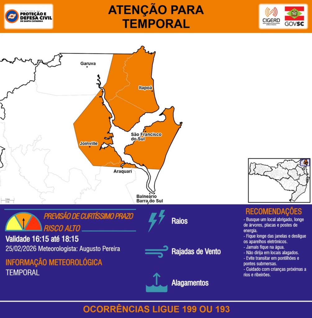 ATENÇÃO – 25/02 16:15 – TEMPORAL com RAIOS, RAJADAS DE VENTO e ALAGAMENTOS para os municípios de Araquari, Balneário Barra do Sul, Garuva, Itapoá, Joinville e São Francisco do Sul nas próximas 2 horas. Ocorrências ligue 199 ou 193.