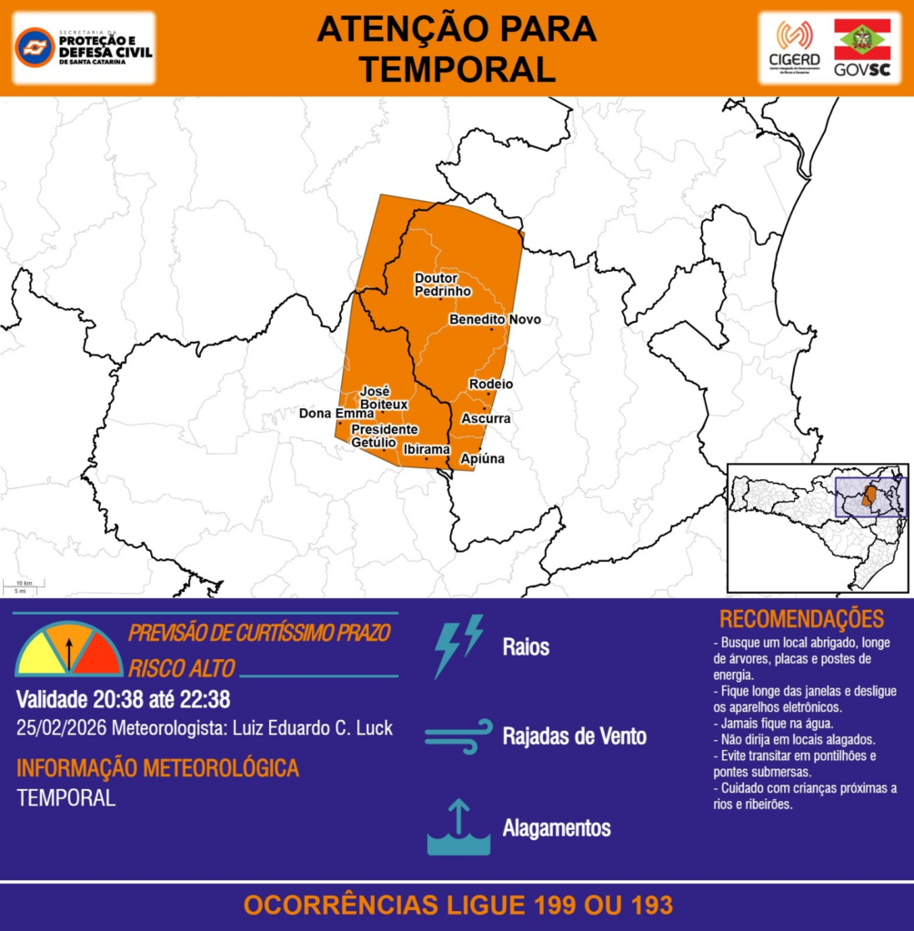 ATENÇÃO – 25/02 20:38 – TEMPORAL com RAIOS, RAJADAS DE VENTO e ALAGAMENTOS para os municípios de Apiúna, Ascurra, Benedito Novo, Dona Emma, Doutor Pedrinho, Ibirama, José Boiteux, Presidente Getúlio, Rodeio nas próximas 2 horas. Ocorrências ligue 199 ou 193.