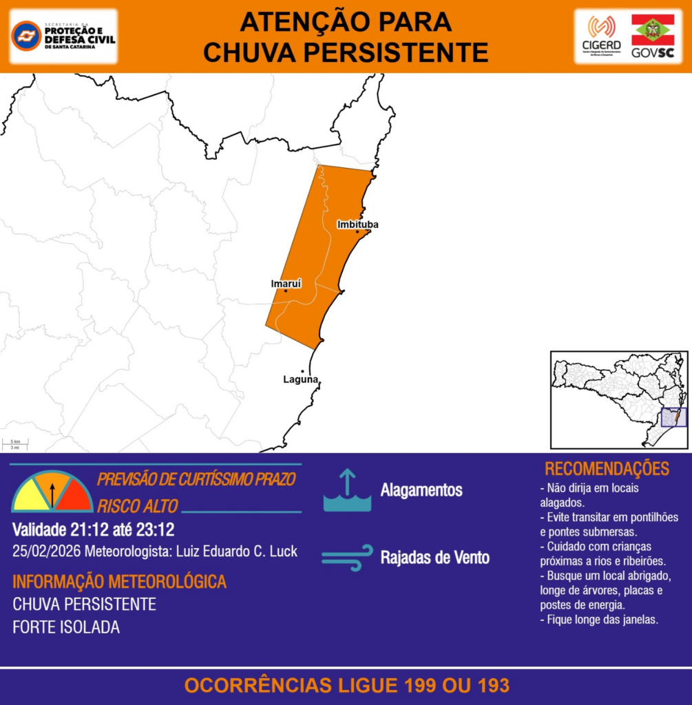 ATENÇÃO – 25/02 21:07 – CHUVA PERSISTENTE de intensidade forte isolada com ALAGAMENTOS e RAJADAS DE VENTO para os municípios de Imaruí, Imbituba e Laguna nas próximas 2 horas. Ocorrências ligue 199 ou 193.