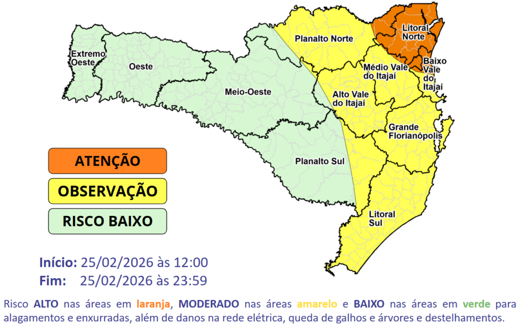 A partir da tarde desta quarta-feira (25), retornam as condições para temporais isolados pelo estado, com raios, rajadas de vento, chuva intensa e curto período tempo e eventual granizo, devido à uma frente fria, cuja instabilidade ainda é reforçada pelo forte calor e umidade disponível. Dos planaltos ao Litoral os temporais ocorrem em maior número se comparado ao Grande Oeste e, por isso, o risco é moderado a alto para ocorrências relacionadas a alagamentos e enxurradas, além de danos na rede elétrica, queda de galhos e árvores e destelhamentos. Nas demais regiões o risco é baixo a moderado, conforme é apresentado no mapa.