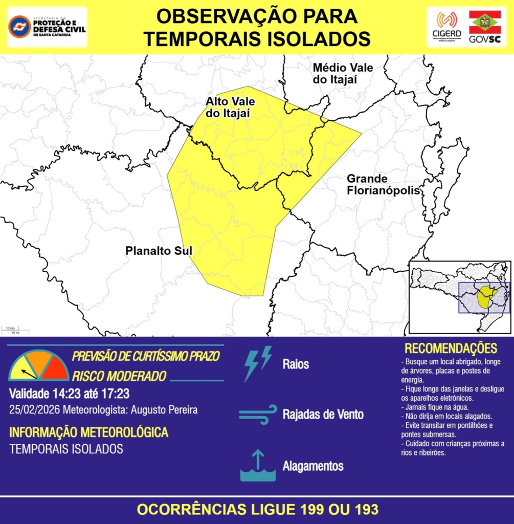 OBSERVAÇÃO – 25/02 14:23 – TEMPORAIS ISOLADOS com RAIOS, RAJADAS DE VENTO e ALAGAMENTOS pontuais para as regiões do Planalto Sul, Grande Florianópolis, Médio e Alto Vale do Itajaí nas próximas 3 horas. Ocorrências ligue 199 ou 193.