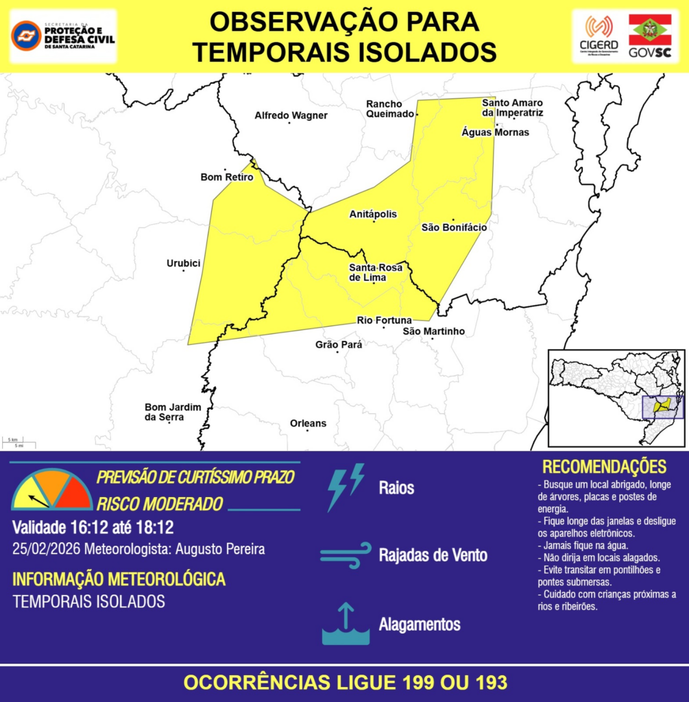 OBSERVAÇÃO – 25/02 16:12 – TEMPORAIS ISOLADOS com RAIOS, RAJADAS DE VENTO e ALAGAMENTOS pontuais para os municípios de Alfredo Wagner, Anitápolis, Bom Jardim da Serra, Bom Retiro, Grão Pará, Orleans, Rancho Queimado, Rio Fortuna, Santa Rosa de Lima, Santo Amaro da Imperatriz, São Bonifácio, São Martinho, Urubici e Águas Mornas nas próximas 2 horas. Ocorrências ligue 199 ou 193.