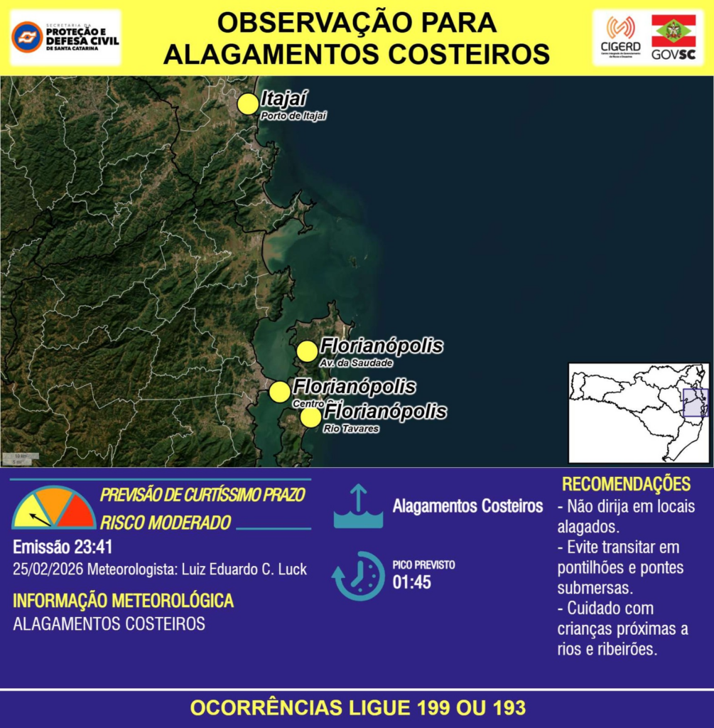 OBSERVAÇÃO – 25/02 23:41 – ALAGAMENTOS COSTEIROS nas próximas horas devido à maré alta para os municípios de Florianópolis e Itajaí. Pico previsto às 01:45 h. Ocorrências ligue 199 ou 193.