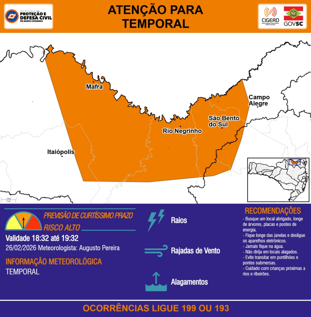 ATENÇÃO – 26/02 18:32 – TEMPORAL com RAIOS, RAJADAS DE VENTO e ALAGAMENTOS para os municípios de Campo Alegre, Itaiópolis, Mafra, Rio Negrinho e São Bento do Sul na próxima hora. Ocorrências ligue 199 ou 193.