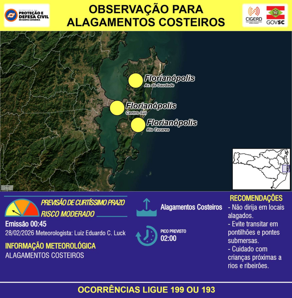 OBSERVAÇÃO – 28/02 00:45 – ALAGAMENTOS COSTEIROS nas próximas horas devido à maré alta para o município de Florianópolis. Pico previsto às 02:00 h. Ocorrências ligue 199 ou 193.