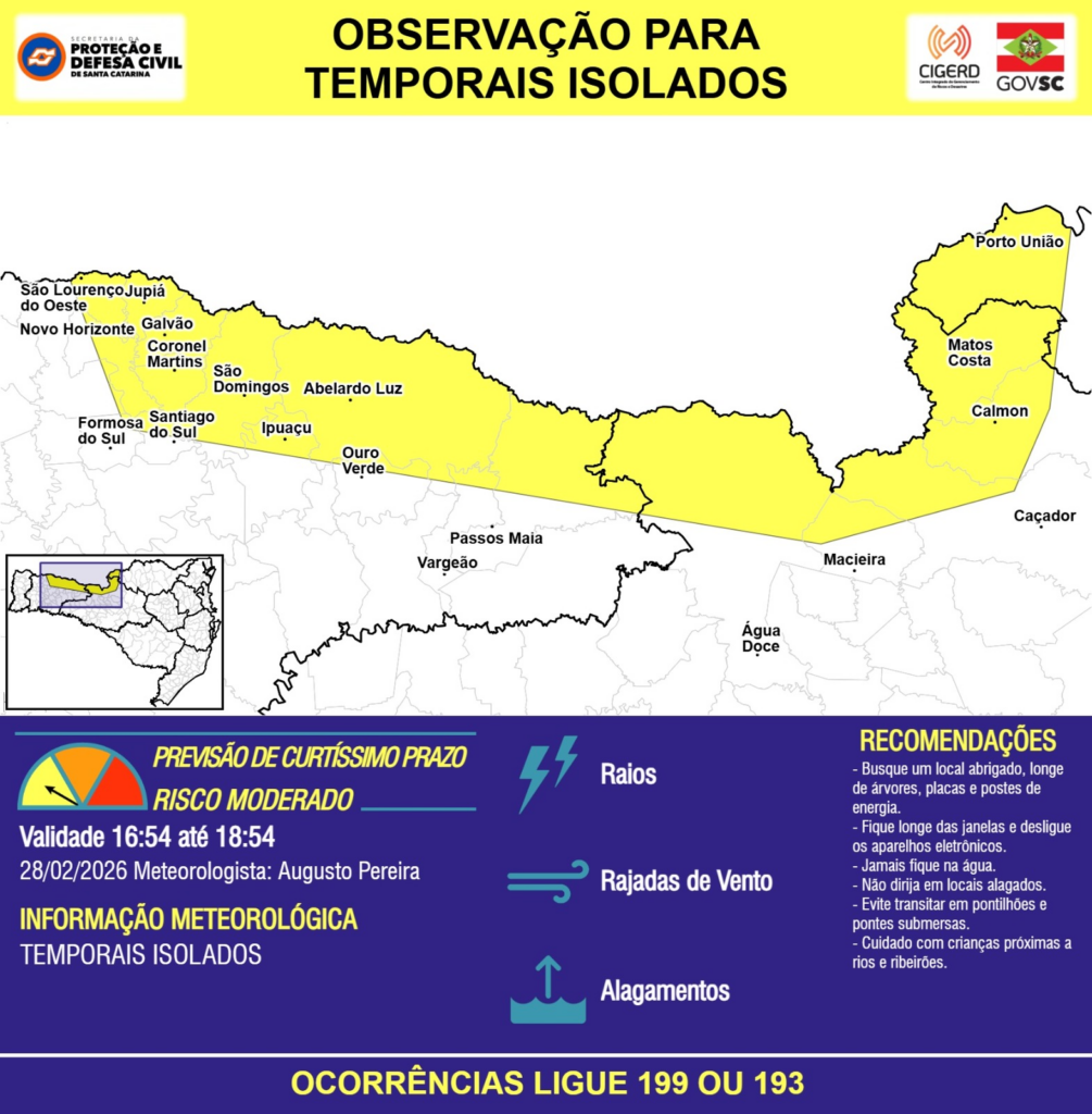 OBSERVAÇÃO – 28/02 16:54 – TEMPORAIS ISOLADOS com RAIOS, RAJADAS DE VENTO e ALAGAMENTOS pontuais para os municípios de Abelardo Luz, Calmon, Caçador, Coronel Martins, Formosa do Sul, Galvão, Ipuaçu, Jupiá, Macieira, Matos Costa, Novo Horizonte, Ouro Verde, Passos Maia, Porto União, Santiago do Sul, São Domingos, São Lourenço do Oeste, Vargeão e Água Doce nas próximas 2 horas. Ocorrências ligue 199 ou 193.