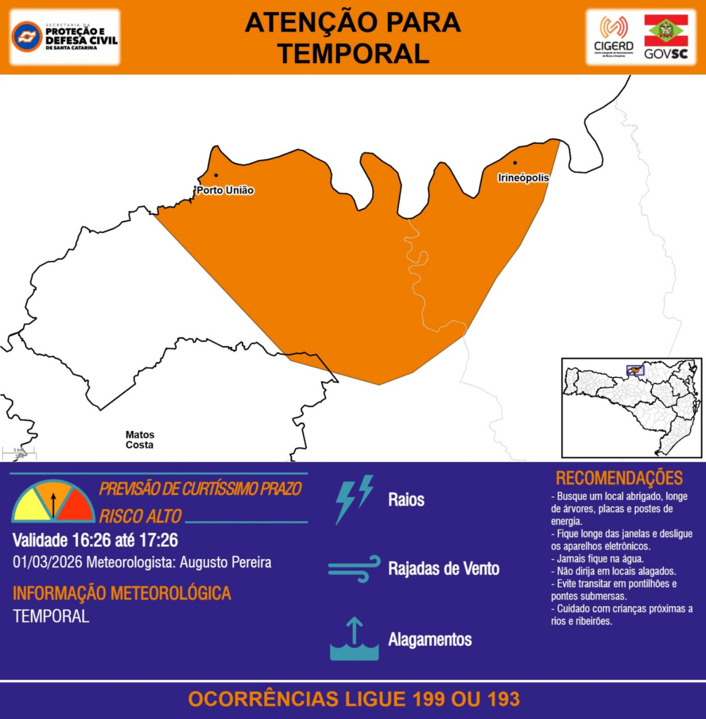 ATENÇÃO – 01/03 16:26 – TEMPORAL com RAIOS, RAJADAS DE VENTO e ALAGAMENTOS para os municípios de Irineópolis, Matos Costa e Porto União na próxima hora. Ocorrências ligue 199 ou 193.