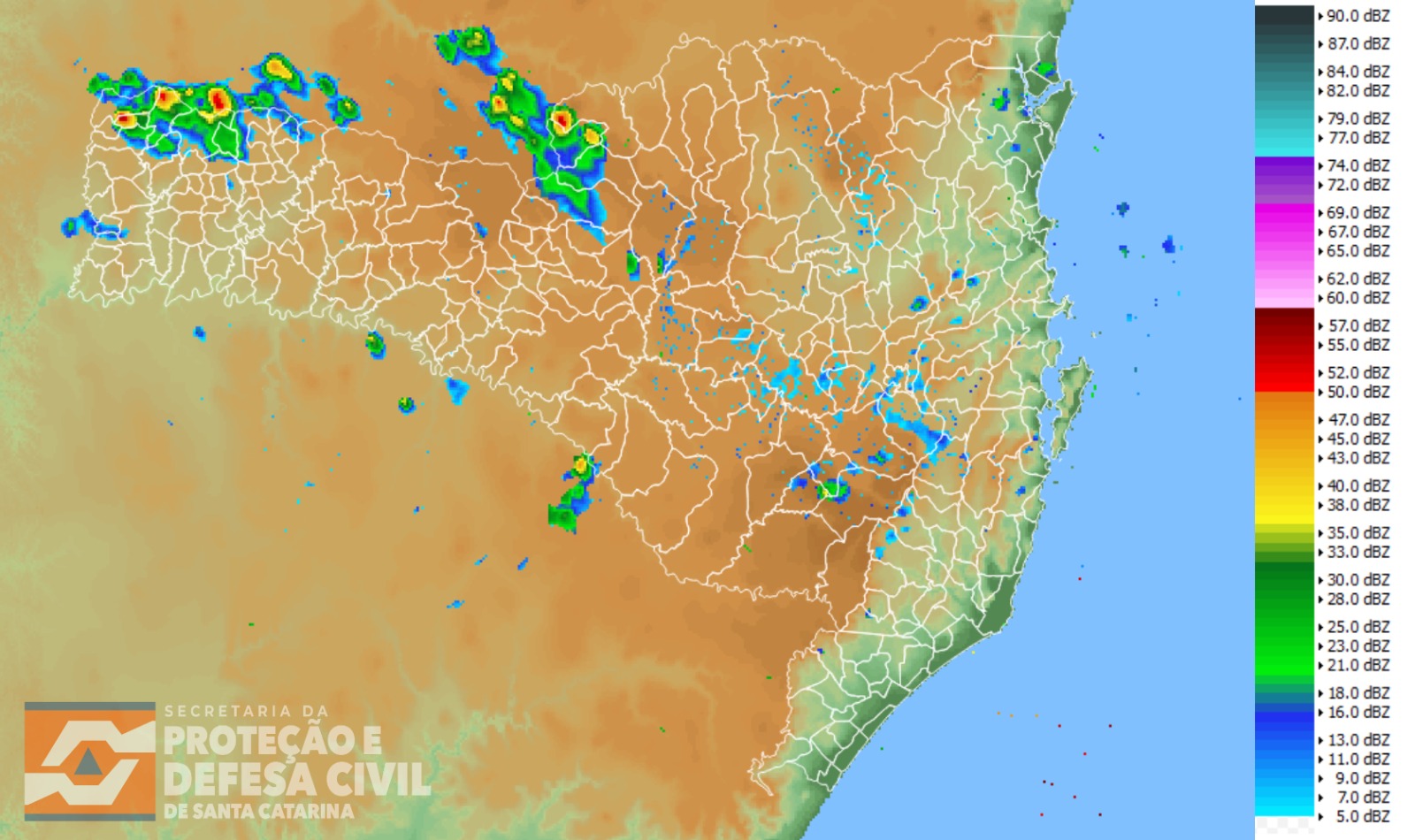 Figura: Composição dos radares meteorológicos, produto CMAX (dBZ) às 16h10, horário local. Fonte: SDC/SC.