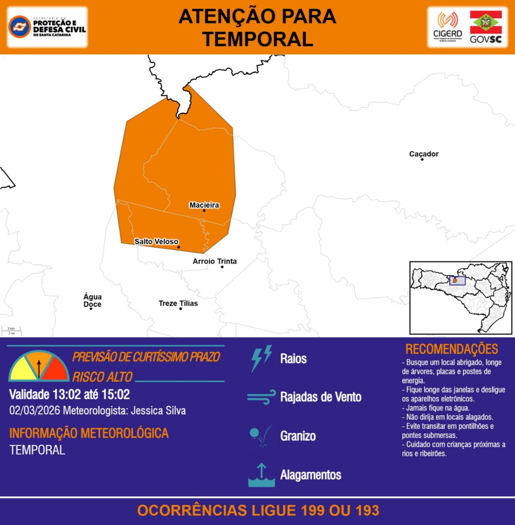 ATENÇÃO – 02/03 13:02 – TEMPORAL com RAIOS, RAJADAS DE VENTO, GRANIZO e ALAGAMENTOS para os municípios de Arroio Trinta, Caçador, Macieira, Salto Veloso, Treze Tílias e Água Doce nas próximas 2 horas. Ocorrências ligue 199 ou 193.