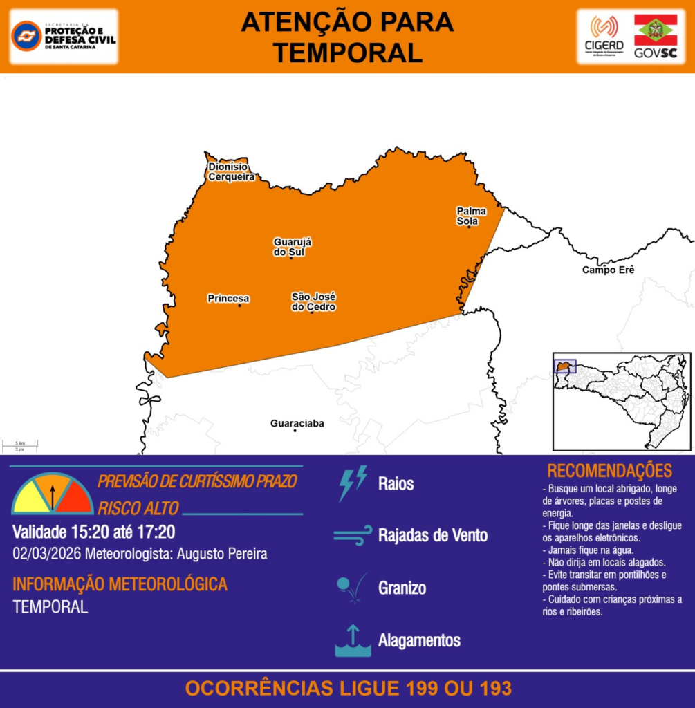 ATENÇÃO – 02/03 15:20 – TEMPORAL com RAIOS, RAJADAS DE VENTO, GRANIZO e ALAGAMENTOS para os municípios de Campo Erê, Dionísio Cerqueira, Guaraciaba, Guarujá do Sul, Palma Sola, Princesa e São José do Cedro nas próximas 2 horas. Ocorrências ligue 199 ou 193.