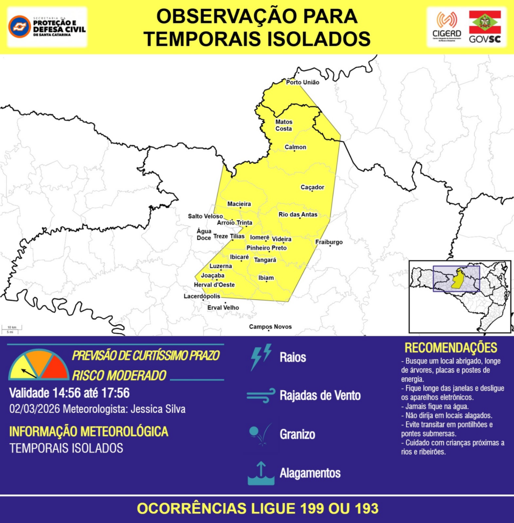 OBSERVAÇÃO – 02/03 14:56 – TEMPORAIS ISOLADOS com RAIOS, RAJADAS DE VENTO, GRANIZO e ALAGAMENTOS pontuais para os municípios de Arroio Trinta, Calmon, Campos Novos, Caçador, Erval Velho, Fraiburgo, Herval d’Oeste, Ibiam, Ibicaré, Iomerê, Joaçaba, Lacerdópolis, Luzerna, Macieira, Matos Costa, Pinheiro Preto, Porto União, Rio das Antas, Salto Veloso, Tangará, Treze Tílias, Videira e Água Doce nas próximas 3 horas. Ocorrências ligue 199 ou 193.