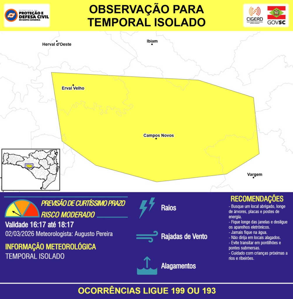 OBSERVAÇÃO – 02/03 16:17 – TEMPORAL ISOLADO com RAIOS, RAJADAS DE VENTO e ALAGAMENTOS pontuais para os municípios de Campos Novos, Erval Velho, Herval d’Oeste, Ibiam, Vargem e Zortéa nas próximas 2 horas. Ocorrências ligue 199 ou 193.