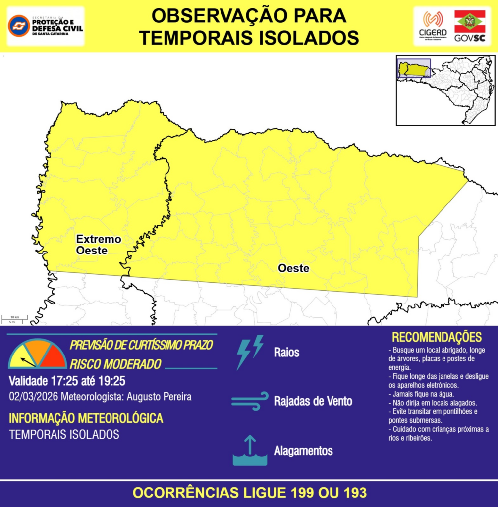 OBSERVAÇÃO – 02/03 17:25 – TEMPORAIS ISOLADOS com RAIOS, RAJADAS DE VENTO e ALAGAMENTOS pontuais para as regiões do Extremo Oeste e Oeste nas próximas 2 horas. Ocorrências ligue 199 ou 193.