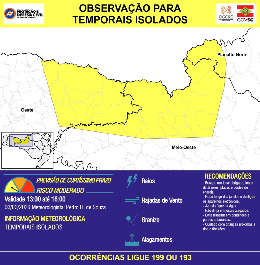 OBSERVAÇÃO – 03/03 13:00 – TEMPORAIS ISOLADOS com RAIOS, RAJADAS DE VENTO, GRANIZO e ALAGAMENTOS pontuais para áreas das regiões do Oeste, Meio-Oeste e Planalto Norte nas próximas 3 horas. Ocorrências ligue 199 ou 193.