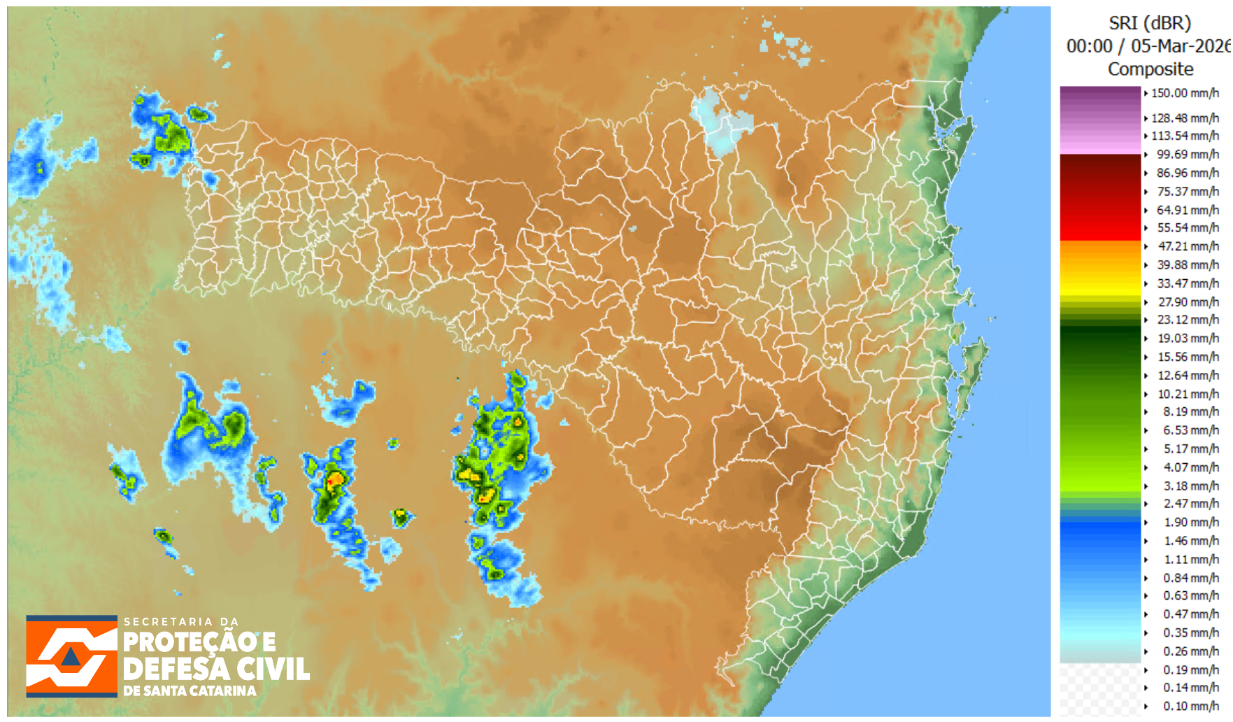 Figura: Imagem da composição dos radares meteorológicos, produto de estimativa de precipitação SRI (dBR) às 21h00 horário local. Fonte: SDC/SC.