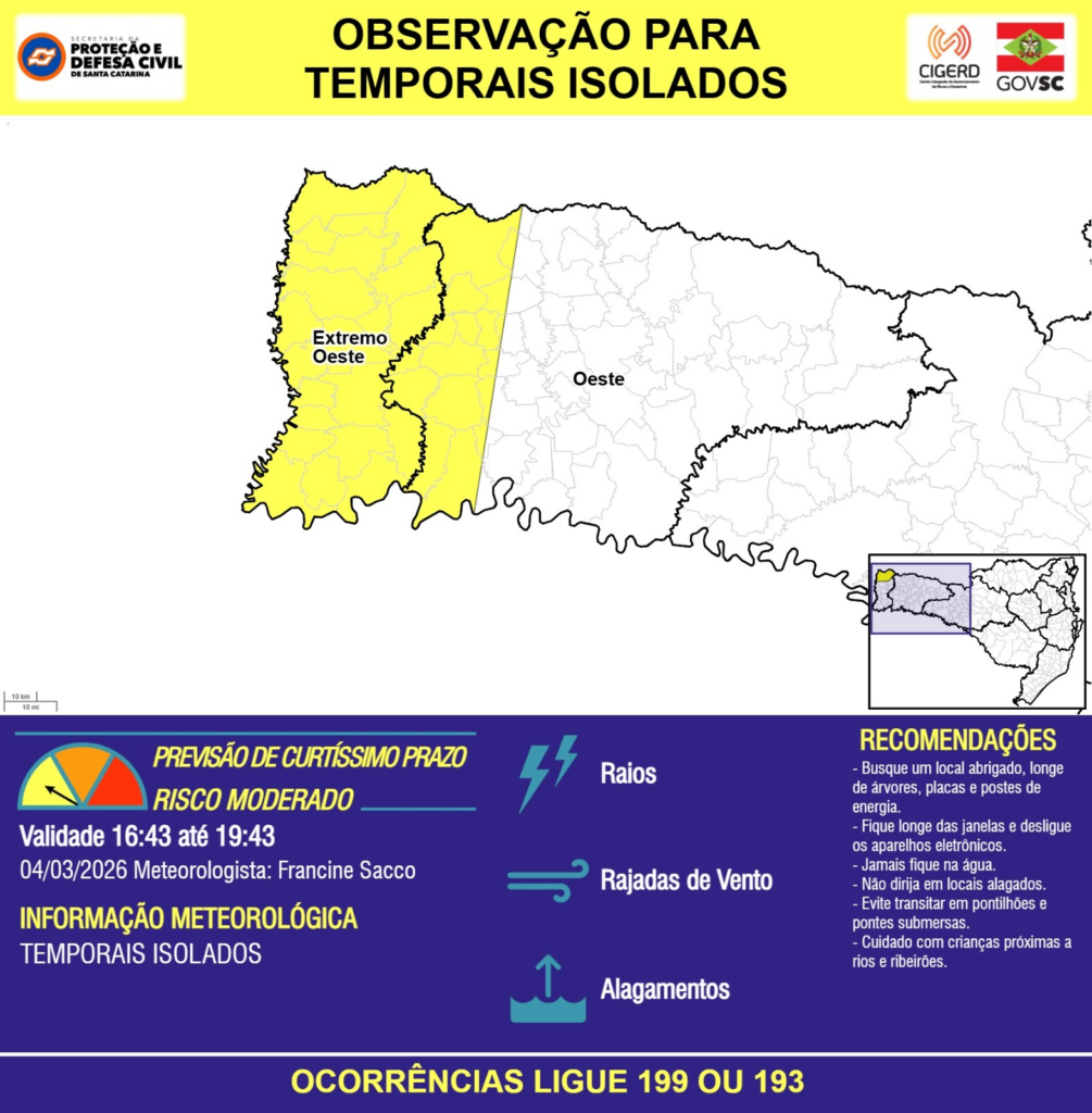 OBSERVAÇÃO – 04/03 16:43 – TEMPORAIS ISOLADOS com RAIOS, RAJADAS DE VENTO e ALAGAMENTOS pontuais para os municípios de Anchieta, Bandeirante, Barra Bonita, Belmonte, Bom Jesus do Oeste, Caibi, Campo Erê, Cunha Porã, Cunhataí, Descanso, Dionísio Cerqueira, Flor do Sertão, Guaraciaba, Guarujá do Sul, Iporã do Oeste, Iraceminha, Itapiranga, Maravilha, Modelo, Mondaí, Palma Sola, Palmitos, Paraíso, Princesa, Riqueza, Romelândia, Saltinho, Santa Helena, Santa Terezinha do Progresso, Saudades, Serra Alta, São Bernardino, São Carlos, São José do Cedro, São João do Oeste, São Miguel da Boa Vista, São Miguel do Oeste, Tigrinhos e Tunápolis nas próximas 3 horas. Ocorrências ligue 199 ou 193.