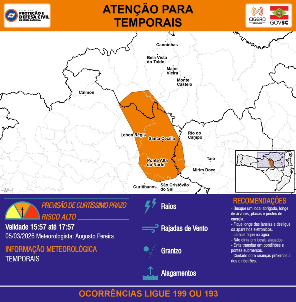 ATENÇÃO – 05/03 15:57 – TEMPORAIS com RAIOS, RAJADAS DE VENTO, GRANIZO e ALAGAMENTOS para os municípios de Bela Vista do Toldo, Calmon, Canoinhas, Curitibanos, Lebon Régis, Major Vieira, Mirim Doce, Monte Castelo, Ponte Alta do Norte, Rio do Campo, Santa Cecília, São Cristóvão do Sul e Taió nas próximas 2 horas. Ocorrências ligue 199 ou 193.