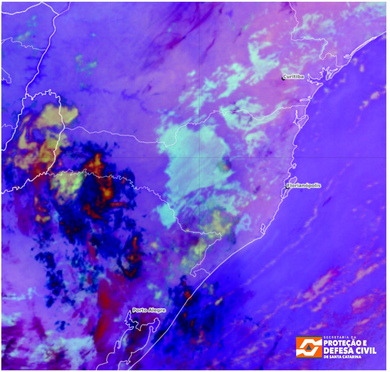 Figura: Imagem do satélite GOES-19, produto Nighttime Microphysics, às 05h30, horário local. Fonte: DSAT/CPTEC, adaptado por SDC/SC.