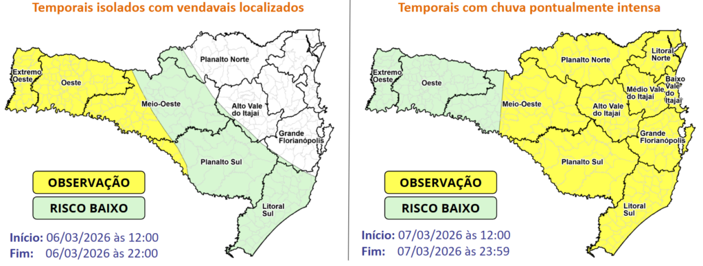 Na sexta-feira, os temporais ocorrem principalmente no Oeste catarinense entre a tarde e a noite, com características típicas de verão: formação rápida, curta duração e potencial para intensas rajadas de vento de maneira localizada. Há risco moderado para ocorrências como destelhamentos, queda de galhos e árvores e danos na rede elétrica. Entre a noite de sexta-feira e a madrugada de sábado, a chuva também pode avançar para áreas do Planalto Sul e do Litoral Sul, porém com menor risco para ocorrências associadas.
