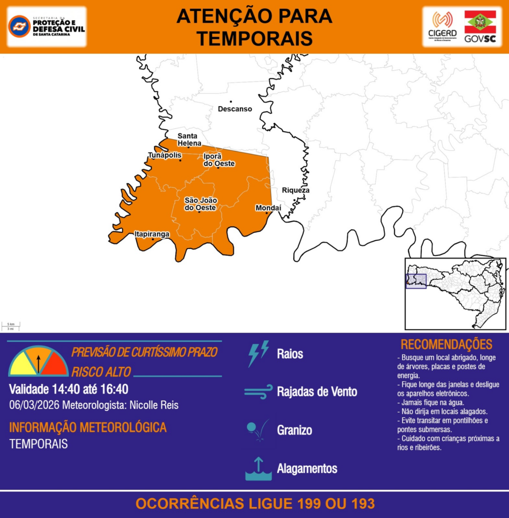 ATENÇÃO – 06/03 14:40 – TEMPORAIS com RAIOS, RAJADAS DE VENTO, GRANIZO e ALAGAMENTOS para os municípios de Descanso, Iporã do Oeste, Itapiranga, Mondaí, Riqueza, Santa Helena, São João do Oeste e Tunápolis nas próximas 2 horas. Ocorrências ligue 199 ou 193.