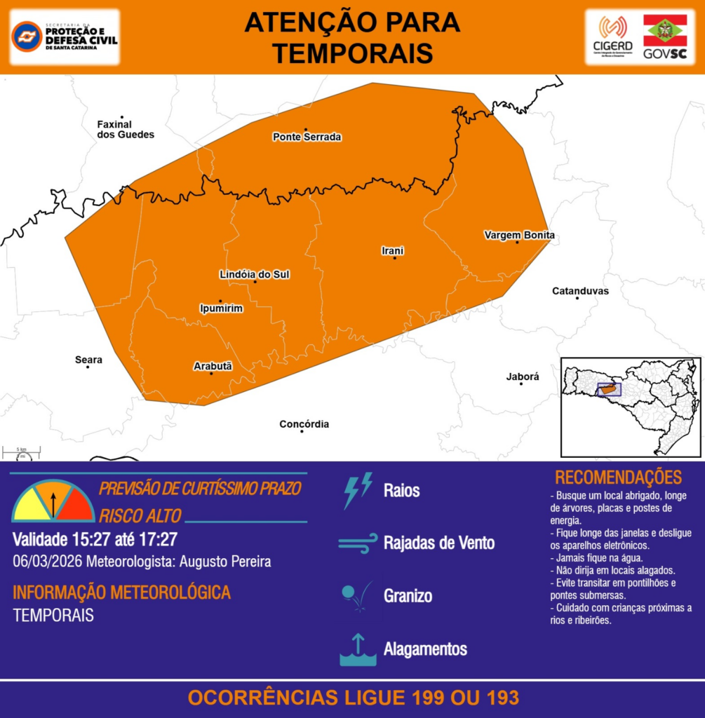 ATENÇÃO – 06/03 15:27 – TEMPORAIS com RAIOS, RAJADAS DE VENTO, GRANIZO e ALAGAMENTOS para os municípios de Arabutã, Catanduvas, Concórdia, Faxinal dos Guedes, Ipumirim, Irani, Jaborá, Lindóia do Sul, Ponte Serrada, Seara e Vargem Bonita nas próximas 2 horas. Ocorrências ligue 199 ou 193.