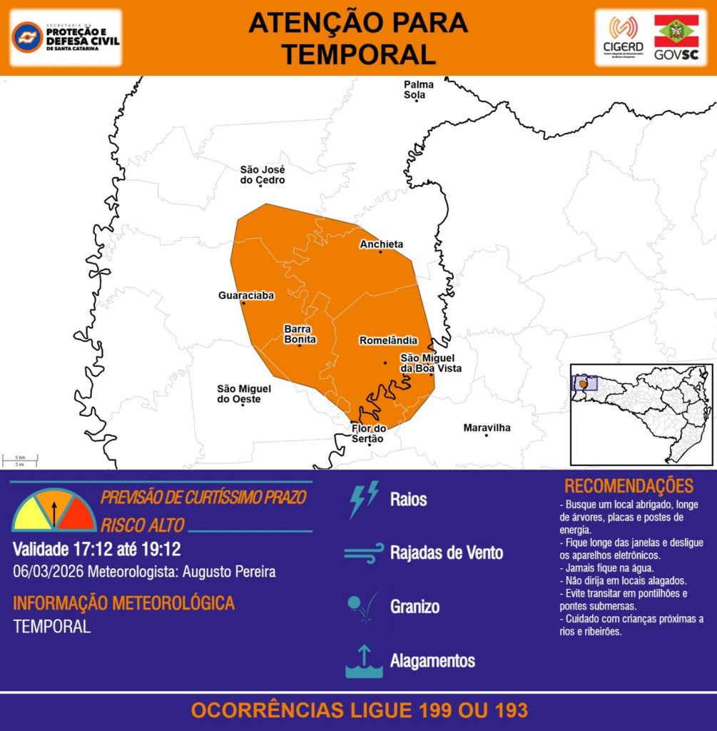 ATENÇÃO – 06/03 17:12 – TEMPORAL com RAIOS, RAJADAS DE VENTO, GRANIZO e ALAGAMENTOS para os municípios de Anchieta, Barra Bonita, Flor do Sertão, Guaraciaba, Maravilha, Palma Sola, Romelândia, São José do Cedro, São Miguel da Boa Vista e São Miguel do Oeste nas próximas 2 horas. Ocorrências ligue 199 ou 193.