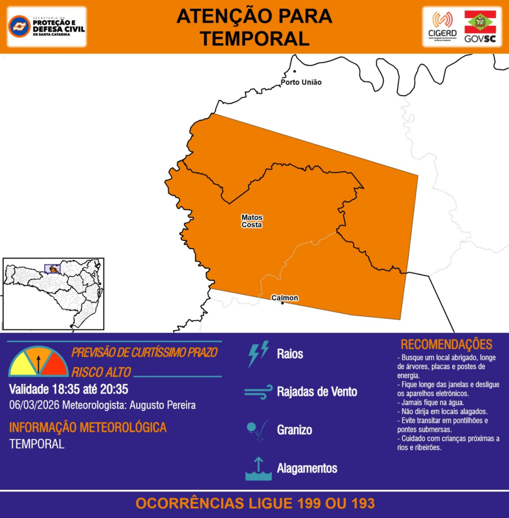 ATENÇÃO – 06/03 18:35 – TEMPORAL com RAIOS, RAJADAS DE VENTO, GRANIZO e ALAGAMENTOS para os municípios de Calmon, Matos Costa e Porto União nas próximas 2 horas. Ocorrências ligue 199 ou 193.