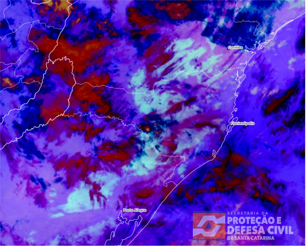 Figura: Imagem do satélite GOES-19, produto Nighttime Microphysics, às 05h20, horário local. Fonte: DSAT/CPTEC, adaptado por SDC/SC.