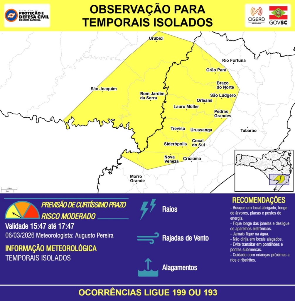 OBSERVAÇÃO – 06/03 15:47 – TEMPORAIS ISOLADOS com RAIOS, RAJADAS DE VENTO e ALAGAMENTOS pontuais para os municípios de Bom Jardim da Serra, Braço do Norte, Cocal do Sul, Criciúma, Grão Pará, Lauro Müller, Morro Grande, Nova Veneza, Orleans, Pedras Grandes, Rio Fortuna, Siderópolis, São Joaquim, São Ludgero, Treviso, Tubarão, Urubici e Urussanga nas próximas 2 horas. Ocorrências ligue 199 ou 193.