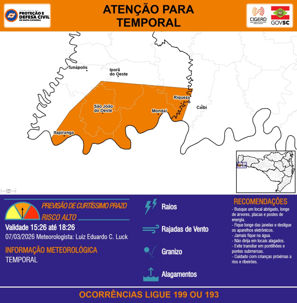 ATENÇÃO – 07/03 15:26 – TEMPORAL com RAIOS, RAJADAS DE VENTO, GRANIZO e ALAGAMENTOS para os municípios de Caibi, Iporã do Oeste, Itapiranga, Mondaí, Riqueza, São João do Oeste e Tunápolis nas próximas 3 horas. Ocorrências ligue 199 ou 193.