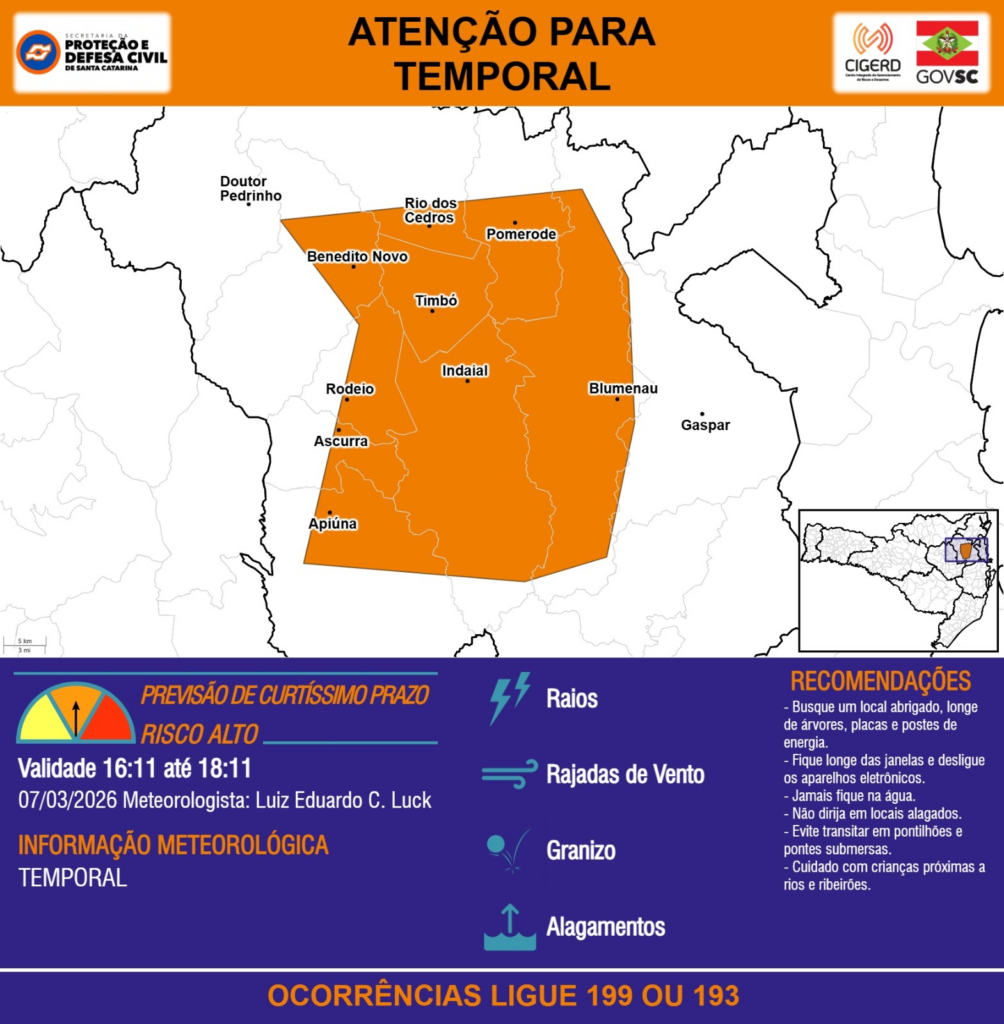 ATENÇÃO – 07/03 16:11 – TEMPORAL com RAIOS, RAJADAS DE VENTO, GRANIZO e ALAGAMENTOS para os municípios de Apiúna, Ascurra, Benedito Novo, Blumenau, Doutor Pedrinho, Gaspar, Indaial, Pomerode, Rio dos Cedros, Rodeio e Timbó nas próximas 2 horas. Ocorrências ligue 199 ou 193.