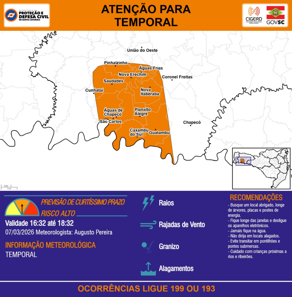 ATENÇÃO – 07/03 16:32 – TEMPORAL com RAIOS, RAJADAS DE VENTO, GRANIZO e ALAGAMENTOS para os municípios de Caxambu do Sul, Chapecó, Coronel Freitas, Cunhataí, Guatambu, Nova Erechim, Nova Itaberaba, Pinhalzinho, Planalto Alegre, Saudades, São Carlos, União do Oeste, Águas Frias e Águas de Chapecó nas próximas 2 horas. Ocorrências ligue 199 ou 193.