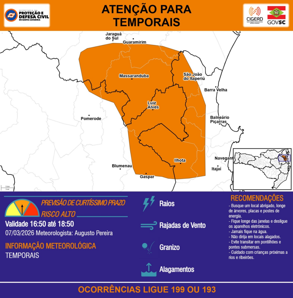 ATENÇÃO – 07/03 16:50 – TEMPORAIS com RAIOS, RAJADAS DE VENTO, GRANIZO e ALAGAMENTOS para os municípios de Araquari, Balneário Piçarras, Barra Velha, Blumenau, Gaspar, Guaramirim, Ilhota, Itajaí, Jaraguá do Sul, Luiz Alves, Massaranduba, Navegantes, Pomerode e São João do Itaperiú nas próximas 2 horas. Ocorrências ligue 199 ou 193.