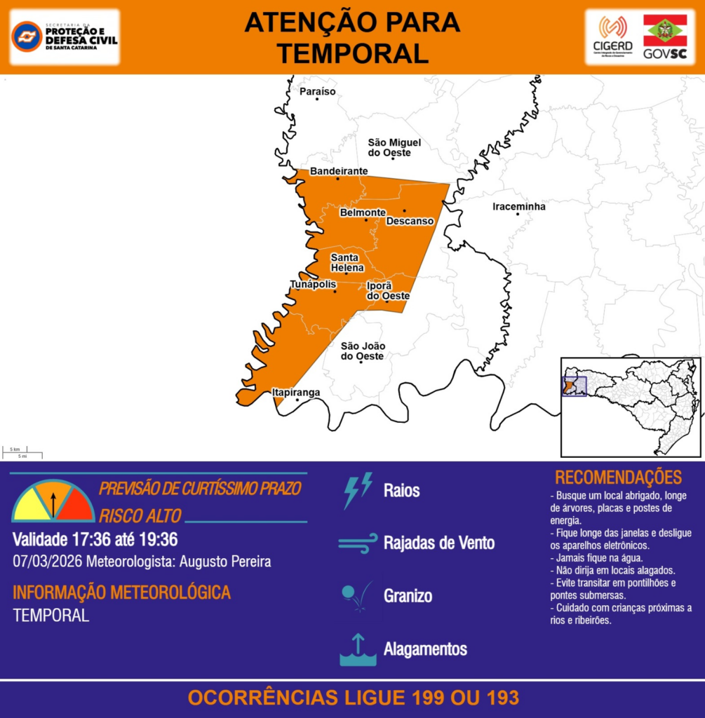 ATENÇÃO – 07/03 17:36 – TEMPORAL com RAIOS, RAJADAS DE VENTO, GRANIZO e ALAGAMENTOS para os municípios de Bandeirante, Belmonte, Descanso, Iporã do Oeste, Iraceminha, Itapiranga, Paraíso, Santa Helena, São João do Oeste, São Miguel do Oeste e Tunápolis nas próximas 2 horas. Ocorrências ligue 199 ou 193.