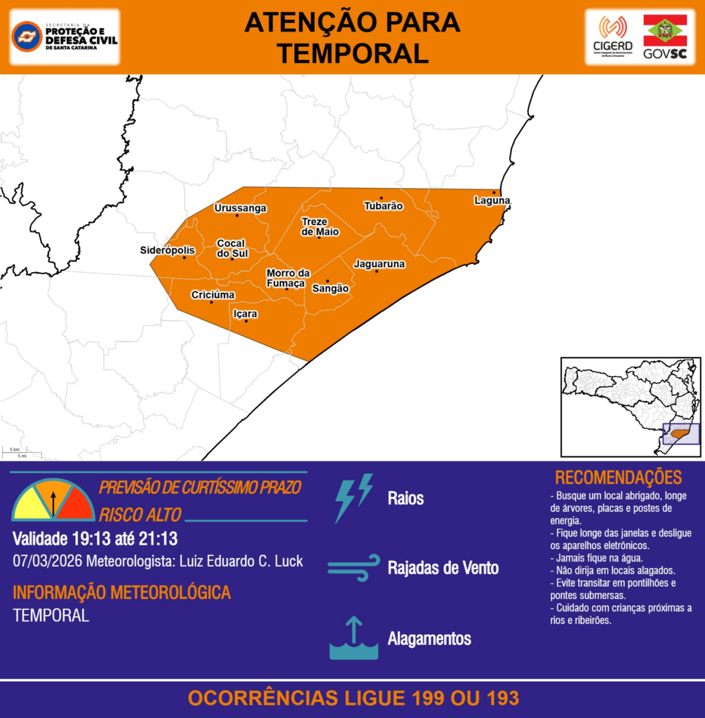 ATENÇÃO – 07/03 19:13 – TEMPORAL com RAIOS, RAJADAS DE VENTO e ALAGAMENTOS para os municípios de Cocal do Sul, Criciúma, Içara, Jaguaruna, Laguna, Morro da Fumaça, Sangão, Siderópolis, Treze de Maio, Tubarão e Urussanga nas próximas 2 horas. Ocorrências ligue 199 ou 193.