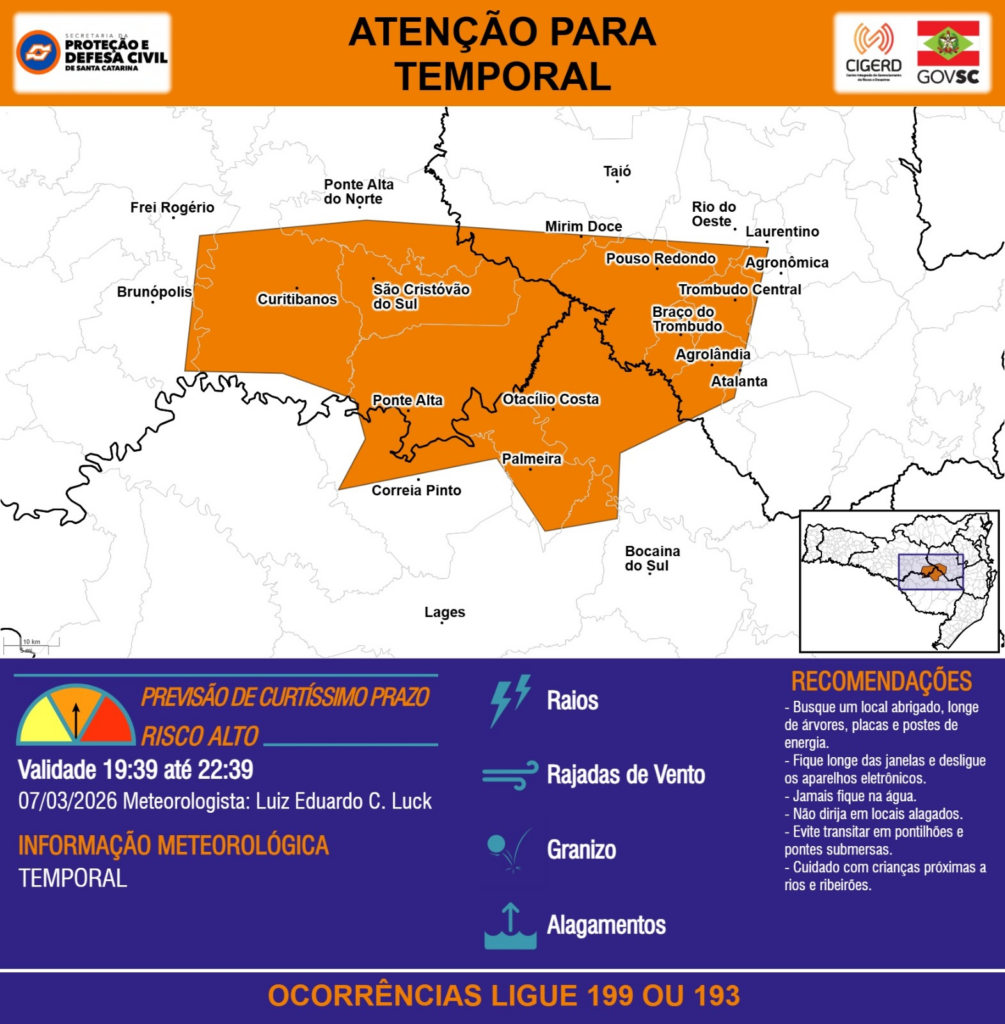ATENÇÃO – 07/03 19:39 – TEMPORAL com RAIOS, RAJADAS DE VENTO, GRANIZO e ALAGAMENTOS para os municípios de Agrolândia, Agronômica, Atalanta, Bocaina do Sul, Braço do Trombudo, Brunópolis, Correia Pinto, Curitibanos, Frei Rogério, Lages, Laurentino, Mirim Doce, Otacílio Costa, Palmeira, Ponte Alta, Ponte Alta do Norte, Pouso Redondo, Rio do Oeste, São Cristóvão do Sul, Taió e Trombudo Central nas próximas 3 horas. Ocorrências ligue 199 ou 193.