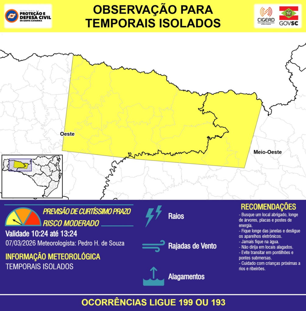 OBSERVAÇÃO – 07/03 10:24 – TEMPORAIS ISOLADOS com RAIOS, RAJADAS DE VENTO e ALAGAMENTOS pontuais para áreas das regiões do Oeste e Meio-Oeste nas próximas 3 horas. Ocorrências ligue 199 ou 193.