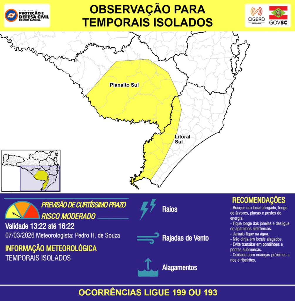 OBSERVAÇÃO – 07/03 13:22 – TEMPORAIS ISOLADOS com RAIOS, RAJADAS DE VENTO e ALAGAMENTOS pontuais para áreas das regiões do Planalto Sul e Litoral Sul nas próximas 3 horas. Ocorrências ligue 199 ou 193.