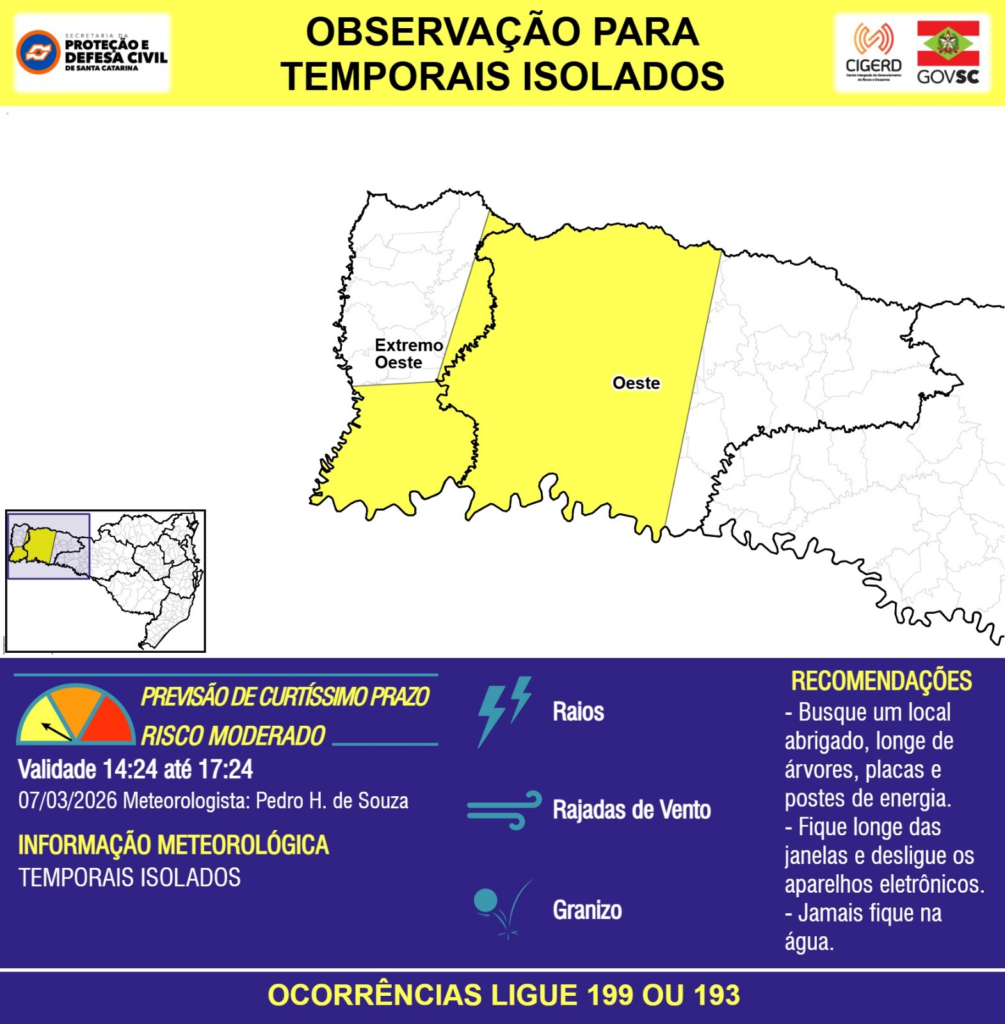 OBSERVAÇÃO – 07/03 14:24 – TEMPORAIS ISOLADOS com RAIOS, RAJADAS DE VENTO e GRANIZO para áreas das regiões do Extremo Oeste e Oeste nas próximas 3 horas. Ocorrências ligue 199 ou 193.