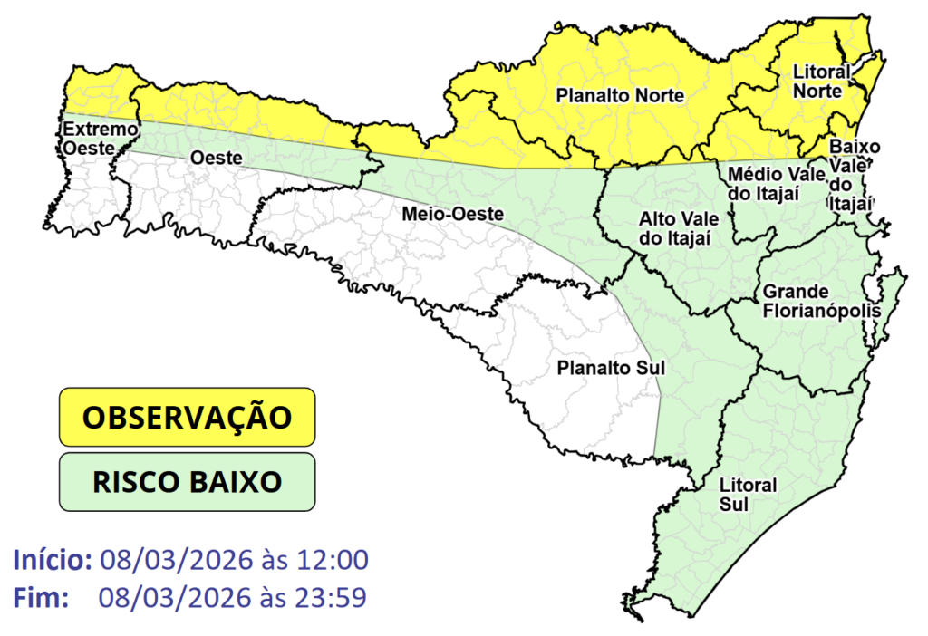 Já nas regiões de divisa com o Paraná os temporais devem ocorrer de forma isoladas acompanhado de raios, rajadas de vento e eventual queda de granizo, dessa forma, o risco é MODERADO para ocorrências associadas a destelhamentos, queda de galhos e árvores, danos na rede elétrica e alagamentos.